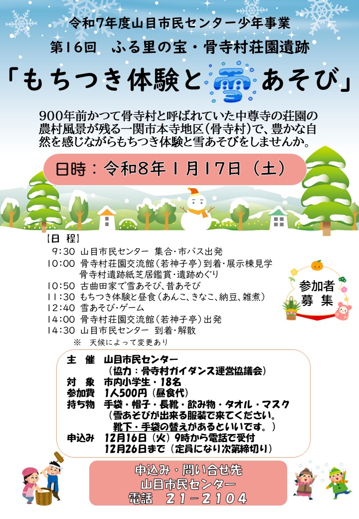 2025年11月21日 / 最終更新日 : 2025年11月21日 yamanome イベント・新着情報 少年事業「もちつき体験と雪あそび」 参加者募集⛄ コメントを残す コメントをキャンセル メールアドレスが公開されることはありません。 * が付いている欄は必須項目ですコメント 名前 * メール * サイト