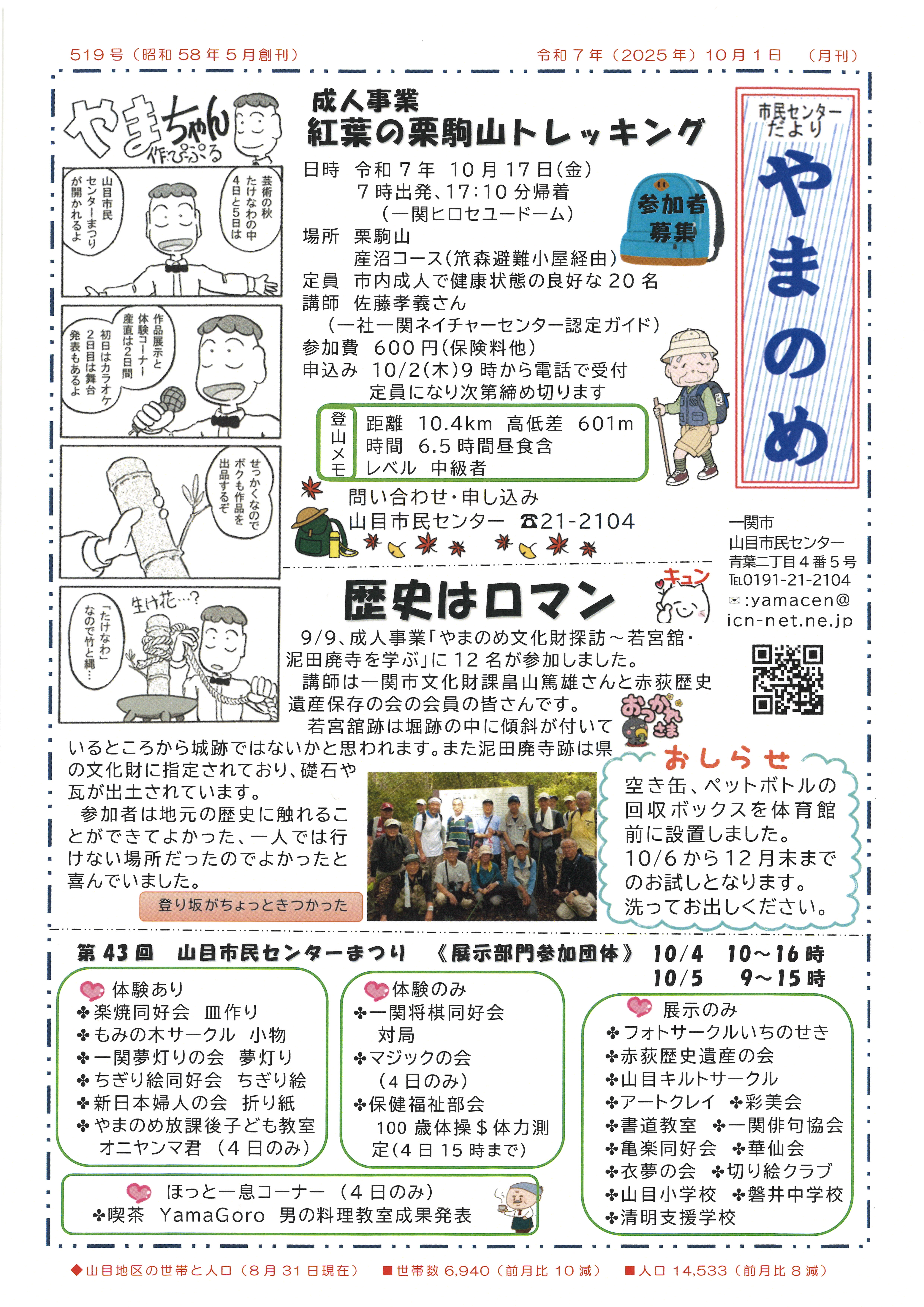 2025年9月25日 / 最終更新日 : 2025年9月25日 yamanome イベント・新着情報 市民センターだより 10月号 コメントを残す コメントをキャンセル メールアドレスが公開されることはありません。 * が付いている欄は必須項目ですコメント 名前 * メール * サイト